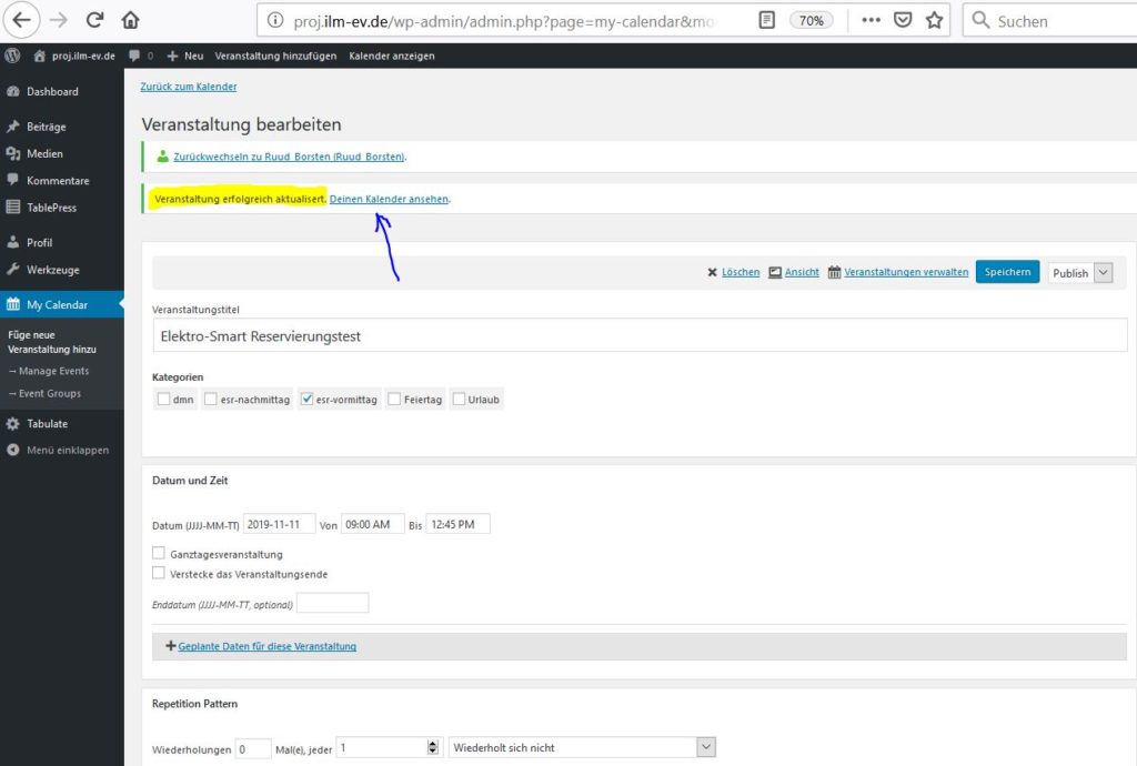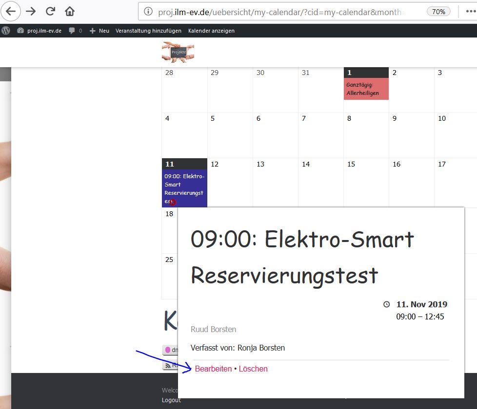 Wie in Schritt 2 erwähnt, ist der gewählte Kategorie falsch. Das wird nun korrigiert. Durch anklicken der Veranstaltung erscheint dieser wieder in einem Fenster und kann mittels den Link bearbeiten geändert werden.